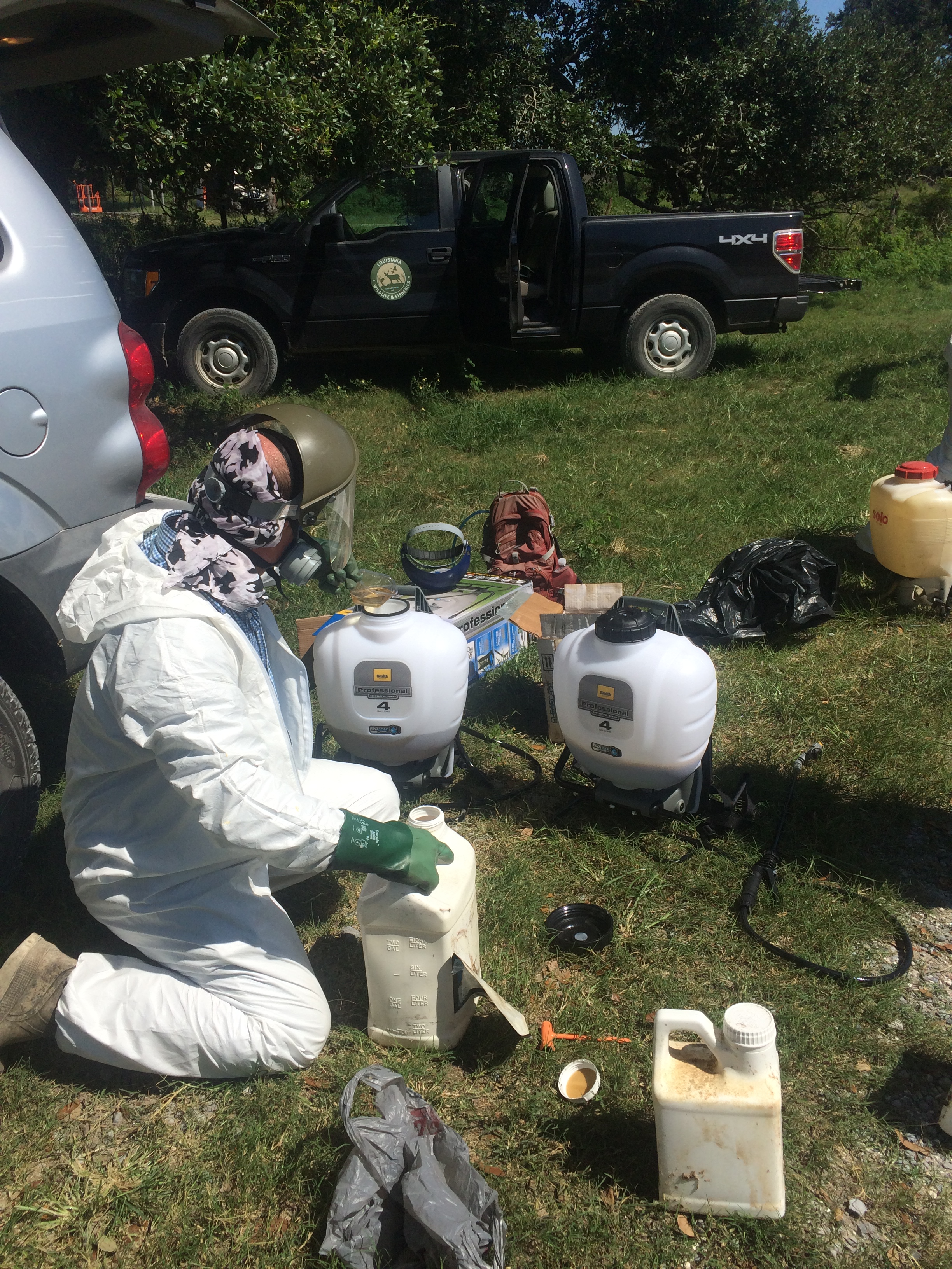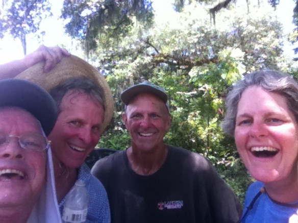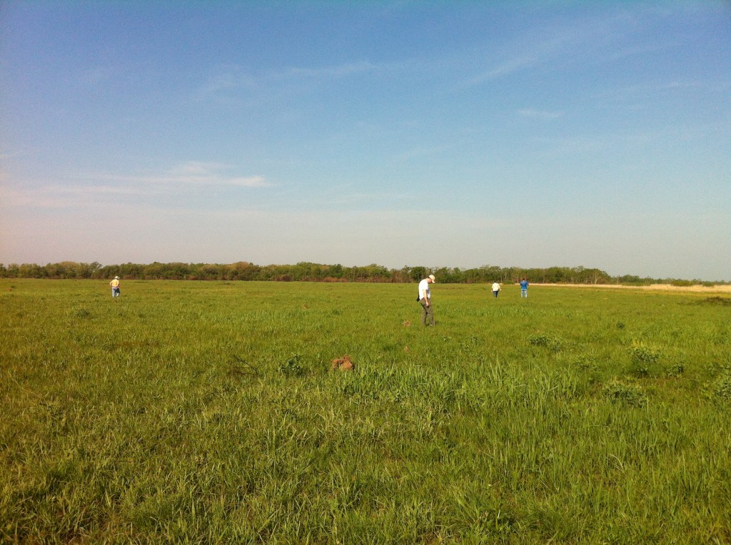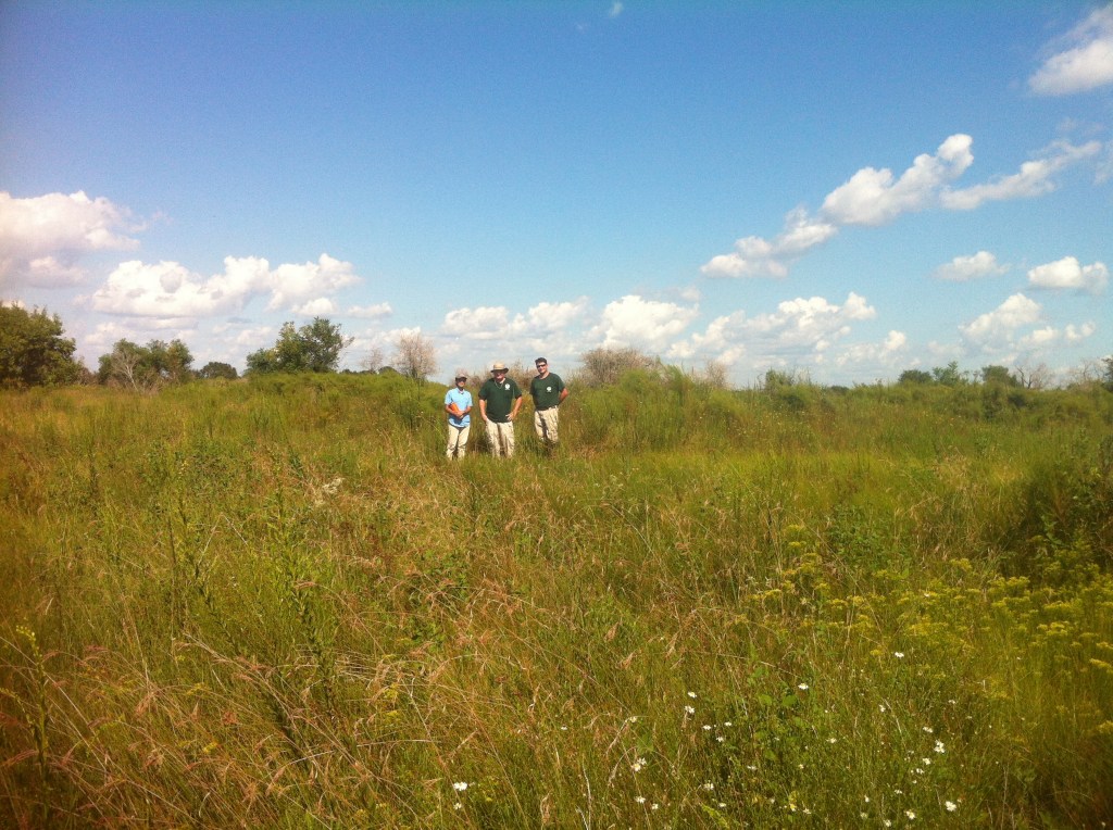 Chris Reid, Chris Doffet and fellow Fish and Wildlife associate at one of the ranch prairies in Cameron Parish, after field work, 2016