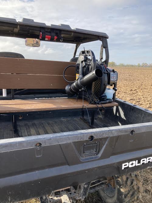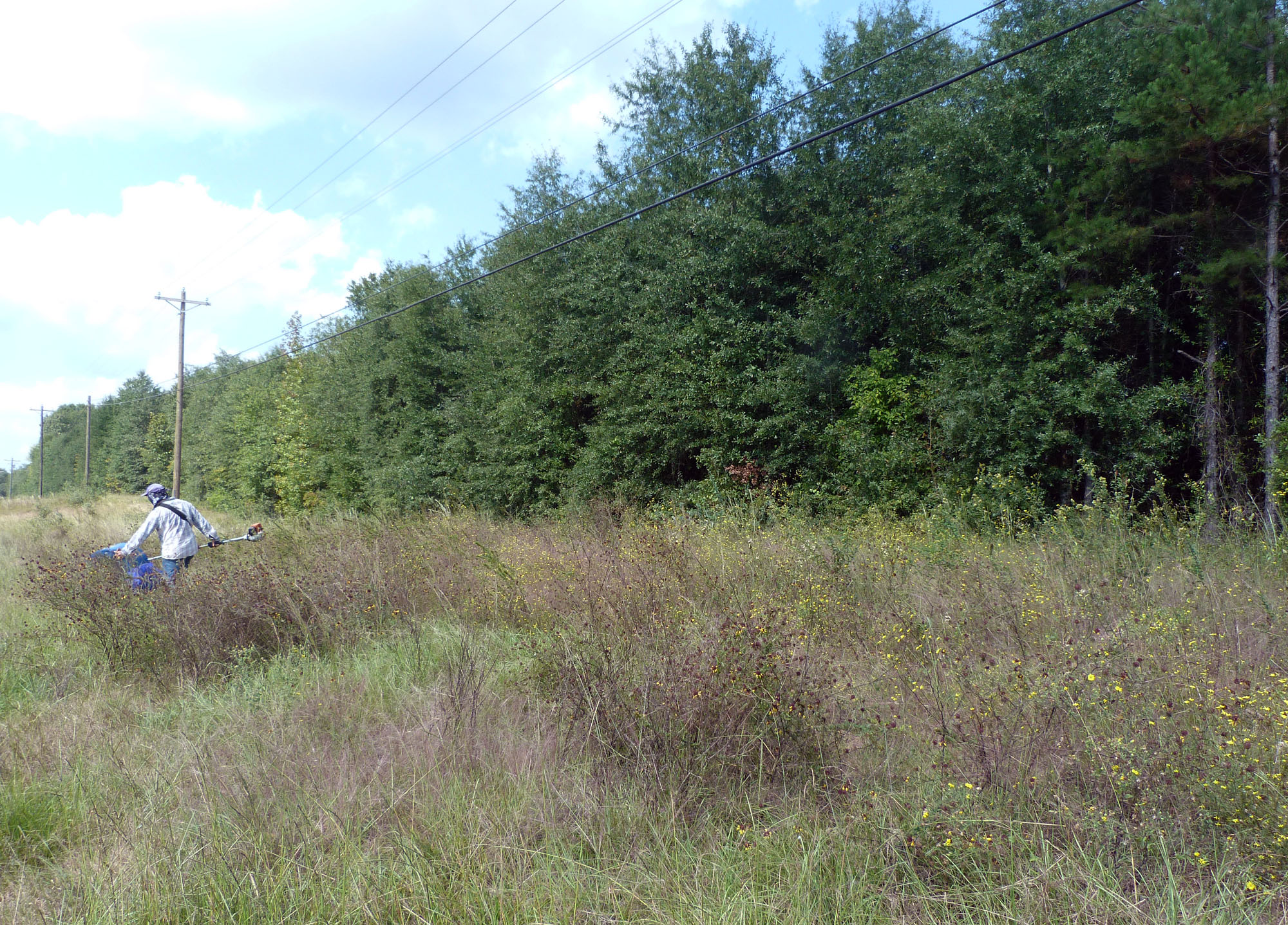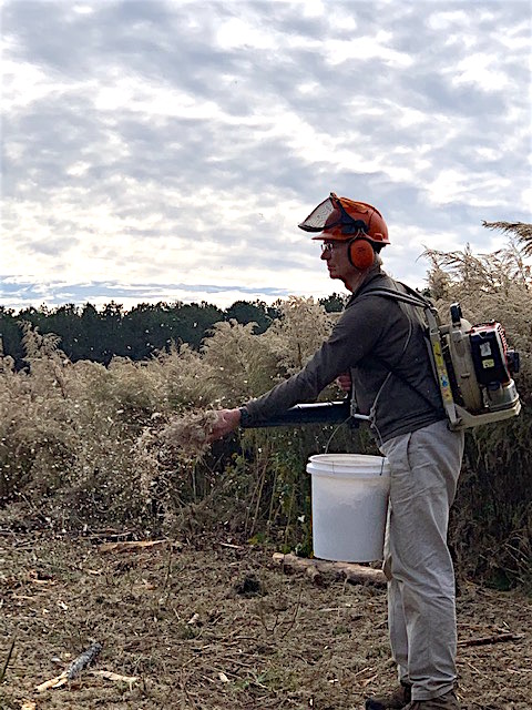 Pastorek collecting seed with hand-held motorized seed thresher on Highway 17 in Sumter County Alabama Black Belt prairie under powerline right of way, 2012