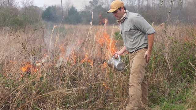 Steve Nevitt igniting Eunice prairie restoration, 2018