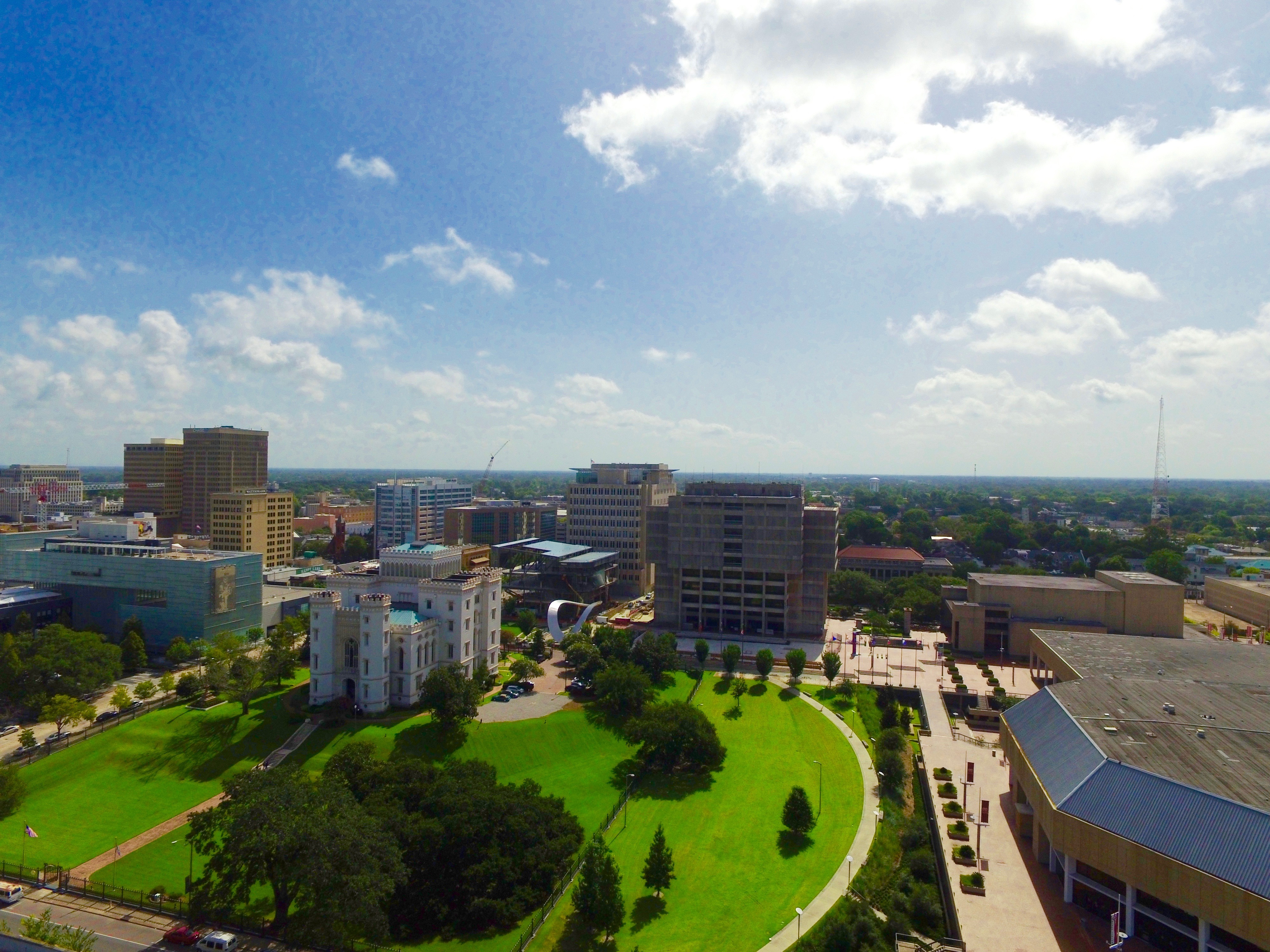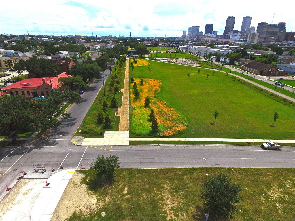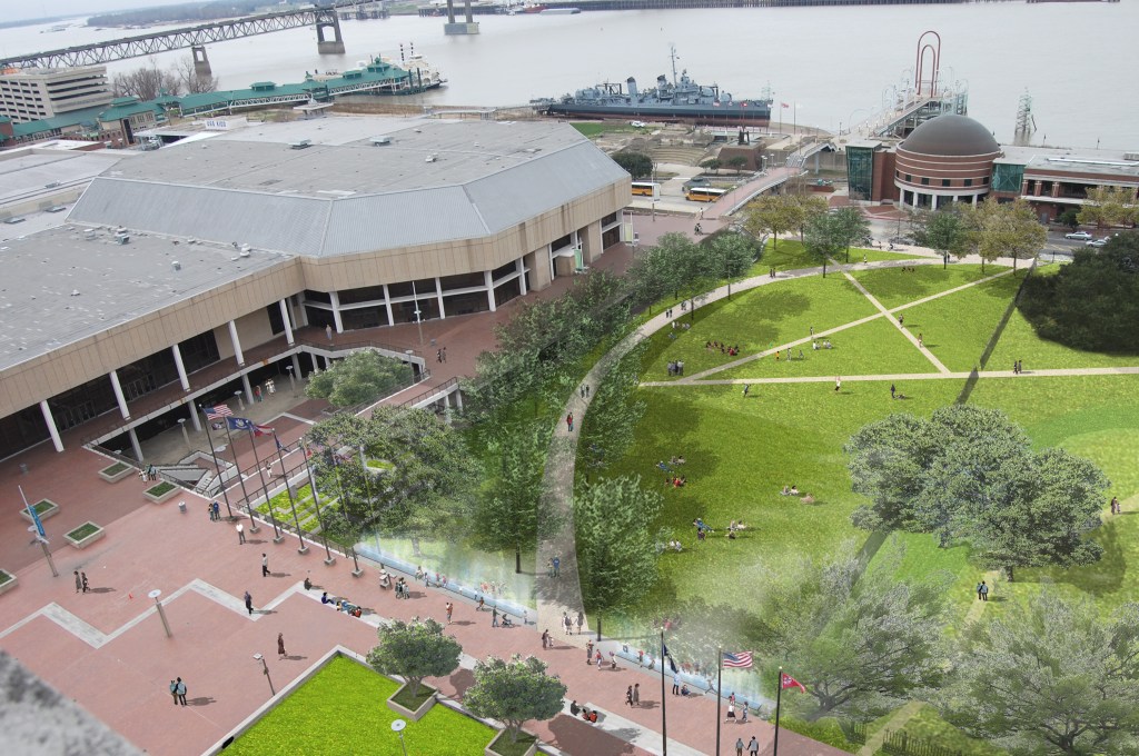 Reed-Hilderbrand/ Pastorek design, Repentance Park, Baton Rouge, La., with Old State Capitol, City Hall (center), and Convention Center (bottom, right), 2018
