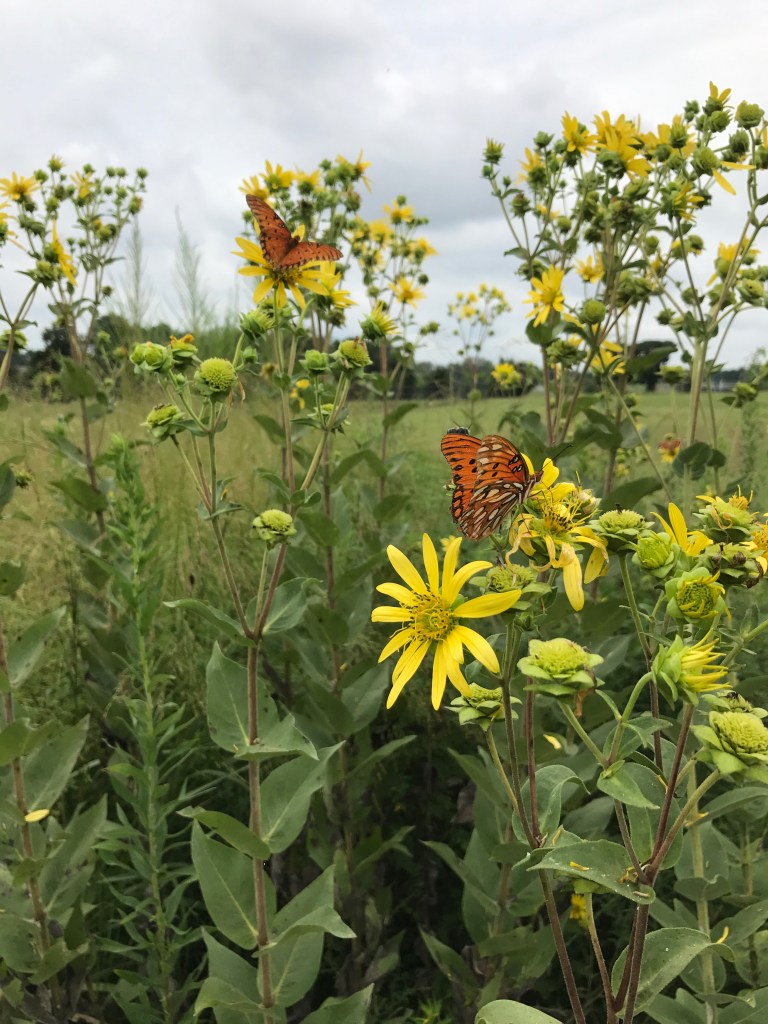 Silphium integrifolium with Gulf Fritillaries, University of Western Alabama prairie gardens, 2017