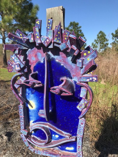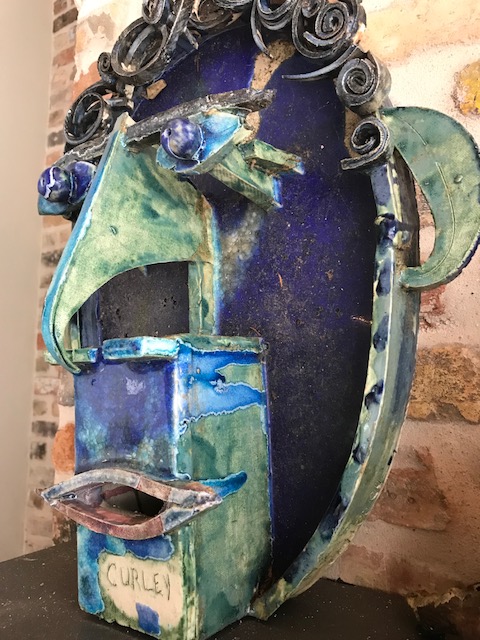 Pastorek garden sculpture, “Curley”, high fire clay, glazes, and Skyy Vodka glass