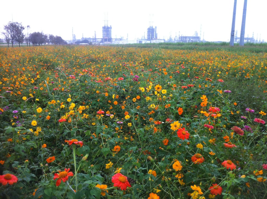 Zinnias, etc., pollinator/ color planting Marathon Oil Refinery, St John The Baptist Parish, Louisiana