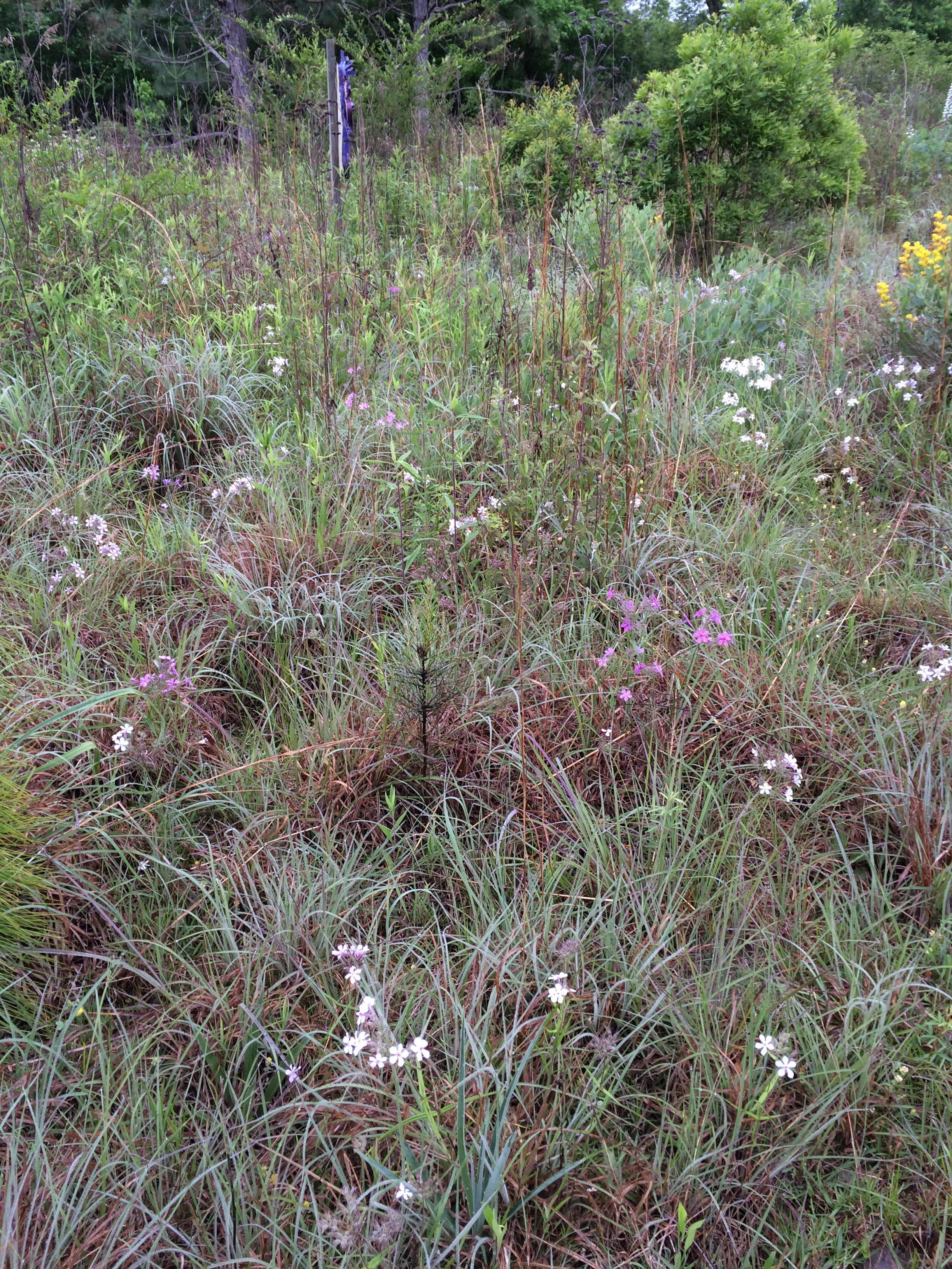 Prairie Phlox Phlox pilosa with Little Bluestem grass in April, Pastorek seed farm, Pearl River County, Mississippi