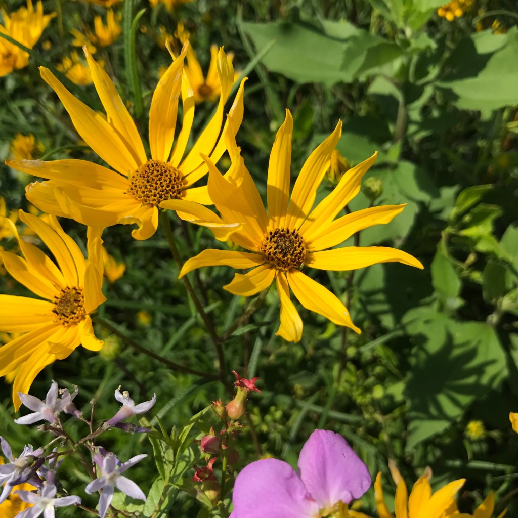 Physostegia, Silphium, and Rudbeckia flowering at Cajun Prairie Gardens, St Landry Parish, La